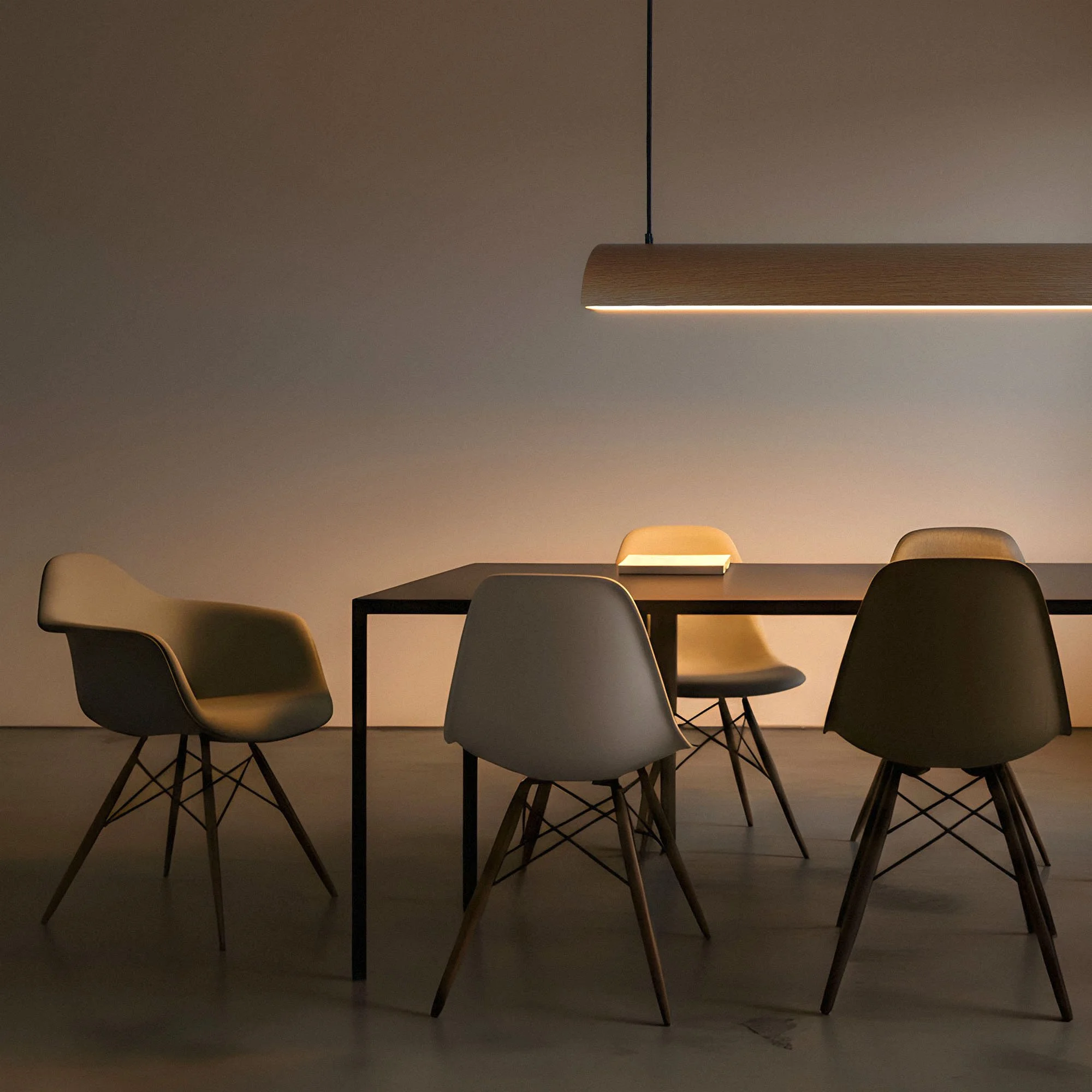 Die Holzleuchte ist inspiriert von der klaren Linienführung traditioneller Industrieleuchten der 60er Jahre. Der gebogene Holzschirm in Eichenfurnier kombiniert mit der s14s Linienlampe sorgt für ein angenehmes Licht, welches durch die natürliche Reflektion des Holzes verstärkt wird. Sie ist perfekt für lange Esstische geeignet und verleiht eine warme und einladende Atmosphäre.